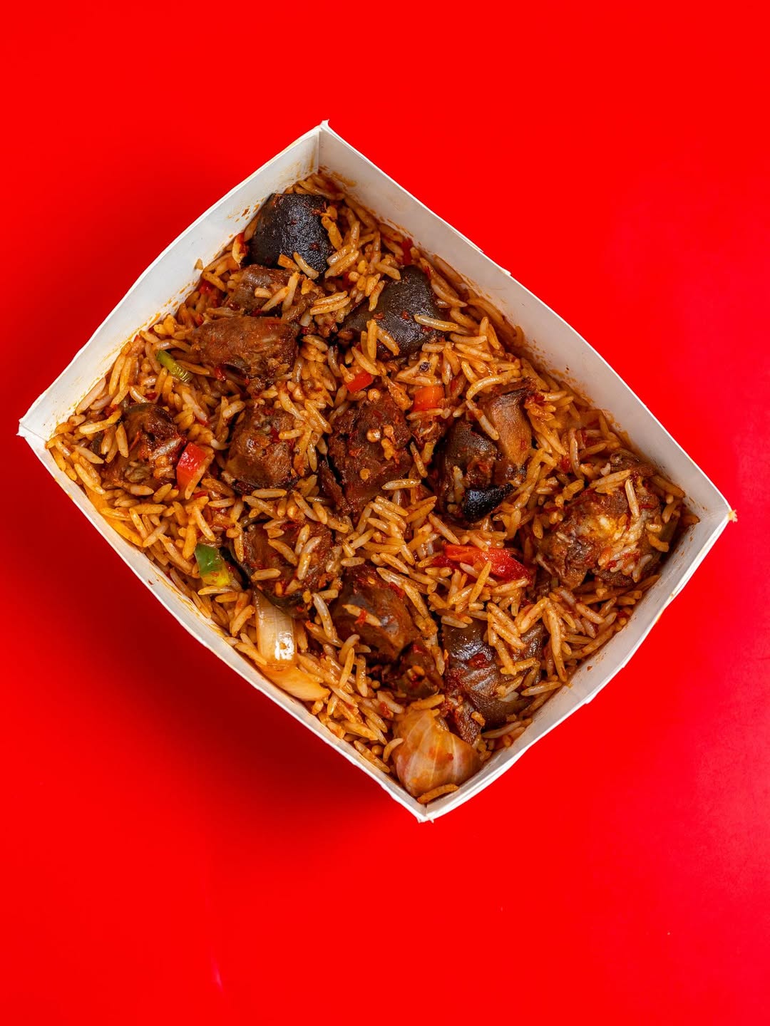 Experience the taste of Lagos streets on one plate. Asun Rice and Chicken blends firewood-style jollof with spicy goat meat and soft grilled chicken — rich, smoky, and made fresh to order.